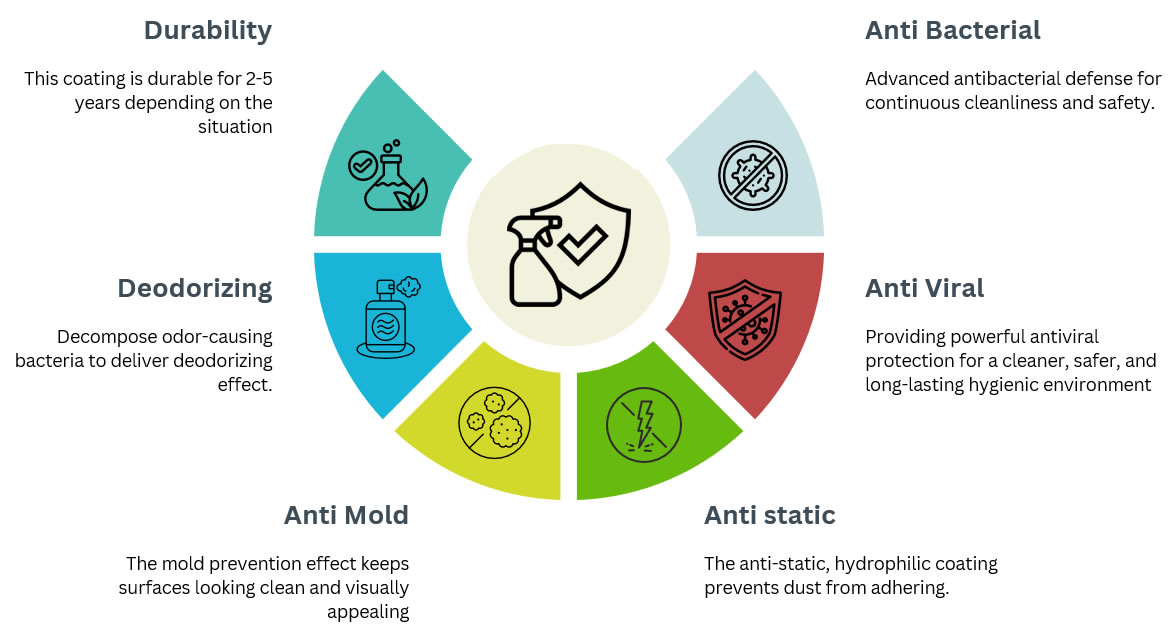 A cutting-edge, long-lasting disinfectant coating that provides continuous protection against harmful microbes, mold, and odors. With its durable formula, AT254 delivers effective hygiene for 2 to 5 years, ensuring sustained cleanliness with minimal maintenance.