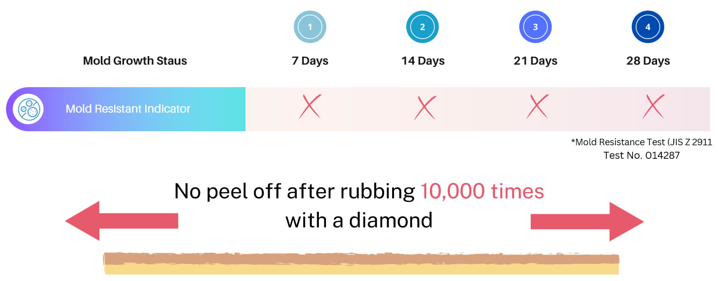 Tests were conducted using the inner mill method, which is stricter than the 16 bacteria specified in the domestic standard (JIS), and it was found to be effective against 57 bacteria that are frequently detected in general buildings, as certified by the International Bio Deterioration Symposium in Denver, USA.