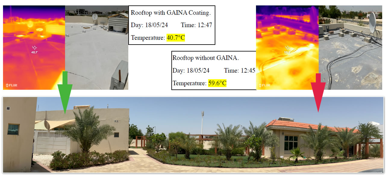 The thermal imaging comparison at Nad Al Sheba clearly shows the effectiveness of GAINA coating on rooftops.
